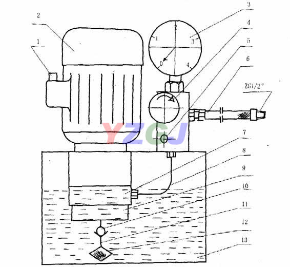 1、電機開關(guān) 2、電機 3、壓力表 4、壓力開關(guān) 5、高壓卸荷 6、出水軟管